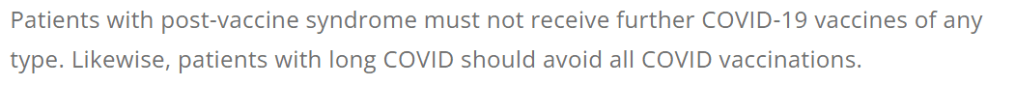 Post-vaccine syndrome is much more common than long covid, and tends to be more severe and long lasting than long covid, due to the extremely high volume of spike protein manufactured by the person’s own cells once the genetic instructions have been injected into the circulation (or, for the non-genetic injections such as Novavax, once spike protein is injected directly). This is why FLCCC also recommend:
