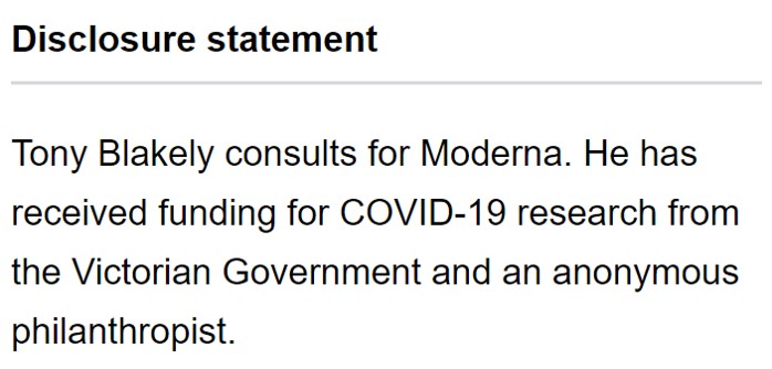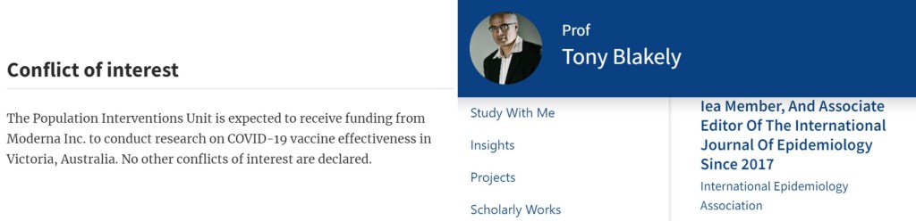 An April 2023 paper, The health impact of long COVID during the 2021–2022 Omicron wave in Australia: a quantitative burden of disease study declares funding connections between Moderna and Blakely’s employer, the Melbourne School of Population and Global Health. This paper is published in the International Journal of Epidemiology, for which Tony has been an Associate Editor since 2017.