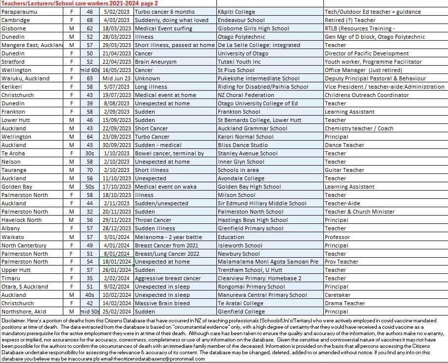 The disclaimer reads: “Here’s a portion of deaths from this Citizens Database that have occurred in New Zealand of teaching professionals (schools/unis/tertiary) who were actively employed in covid vaccine mandated positions at time of death. The data extracted from the database is based on “circumstantial evidence” only, with a high degree of certainty that they would have received a covid vaccine as a mandatory prerequisite for the active employment they were in at the time of their death. Although care has been taken to ensure the quality and accuracy of the information, the authors make no warranty, express or implied, nor assurances for the accuracy, correctness, completeness or use of any information on the database. Given the sensitive and controversial nature of vaccines, it may not have been possible for the authors to confirm the circumstances of death with an immediate family member of the deceased. Information is provided on the basis that all persons accessing the Citizens Database undertake responsibility for assessing the relevance and accuracy of its content. The database may be changed, deleted, added to or amended without notice. If you find any info on this database you believe may be inaccurate, please email thecitizensdatabasenz@protonmail.com“