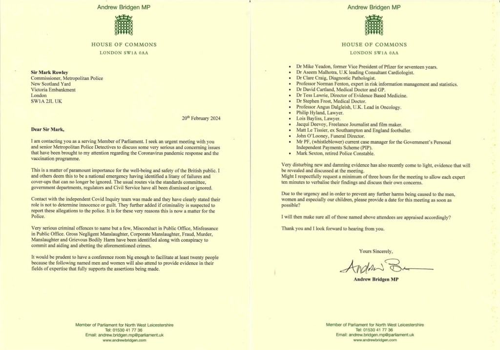 English MP Andrew Bridgen penned this 20 February 2024 letter to the Commissioner of the London Metropolitan Police.