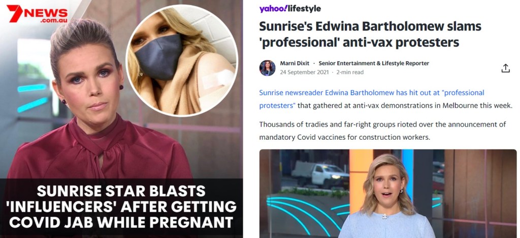 Channel Seven Sunrise are a strong arm of the propaganda machine, and the final straw that stopped me from watching mainstream “news” in 2020. In this 2021 clip, Sunrise host Edwina Bartholomew, pregnant, demonstrates the power of propaganda.