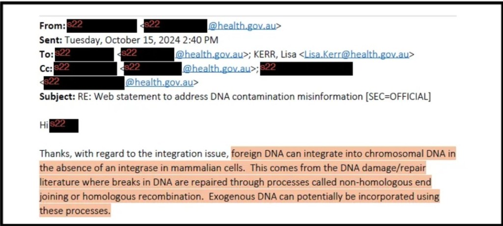The disclosure relates to the TGA’s announcement in October, which tried to quash “misinformation” about the potential for residual DNA to integrate into the human genome.