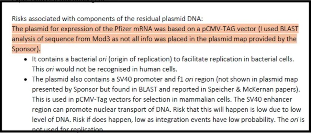 Researchers Kevin McKernan and Jessica Rose both point to the reference of a “CMV promoter” in Pfizer’s plasmid DNA, a gene sequence not previously identified in vaccine lots.