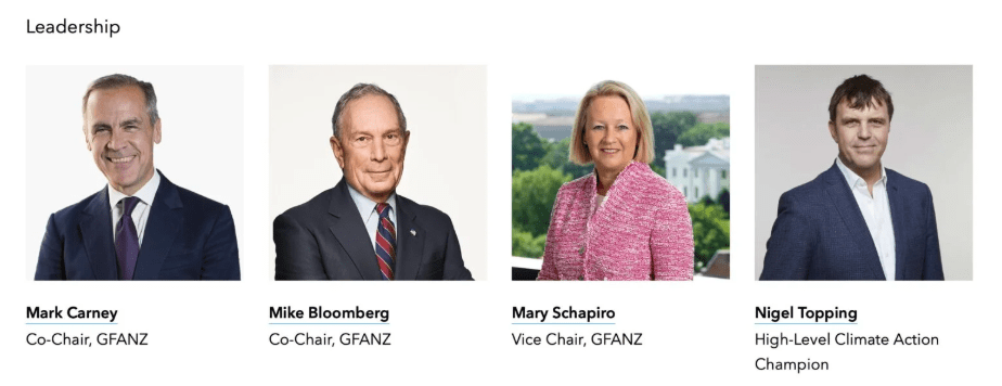 This alliance, called the Glasgow Financial Alliance for Net Zero (GFANZ), was launched in April by John Kerry, US Special Presidential Envoy for Climate Change; Janet Yellen, US Secretary of the Treasury and former chair of the Federal Reserve; and Mark Carney, UN Special Envoy for Climate Action and Finance and former chair of the Bank of England and Bank of Canada. Carney, who is also the UK prime minister’s Finance Advisor for the COP26 conference, currently cochairs the alliance with US billionaire and former mayor of New York City, Michael Bloomberg.