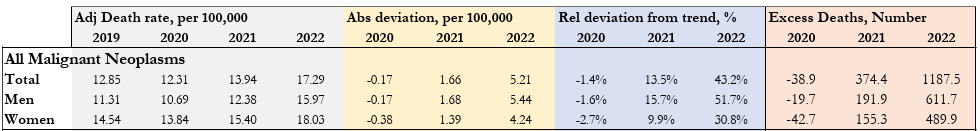 These are excess deaths from malignant neoplasms in the UK, based on a study of ICD10 codes. Until and including 2020, there were zero excess deaths from these causes. From 2021 they jumped.