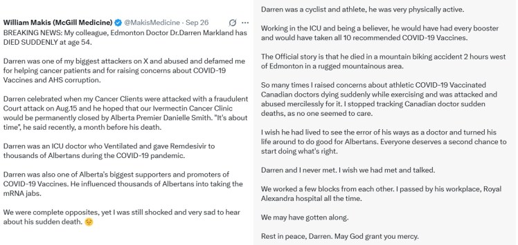 Dr Makis erupted onto the covid scene in 2021 when he began reporting the explosion of deaths amongst Canadian doctors. Two years later he began reporting on his experiences using cheap and safe repurposed drugs to treat cancer. His most recent report on a deceased colleague, here.
