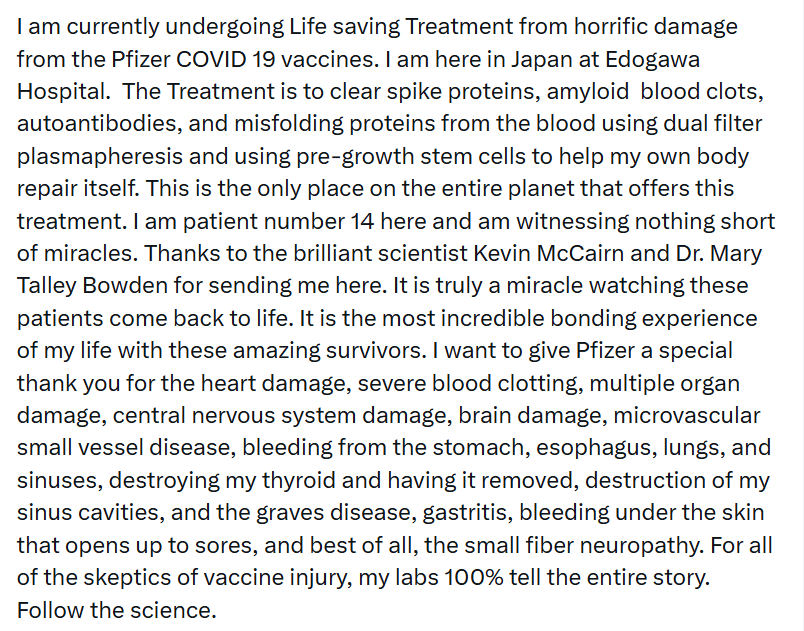 Dr McCairn has teamed up with the Japanese scientists and doctors who have been speaking out non stop against the crimes that have taken place against population health in the name of “public health”, which has been flipped on its head to “public harm”. They are now at Patient Number 14 – Ken Evans, featured here. The results appear to be health-restoring and life saving!
